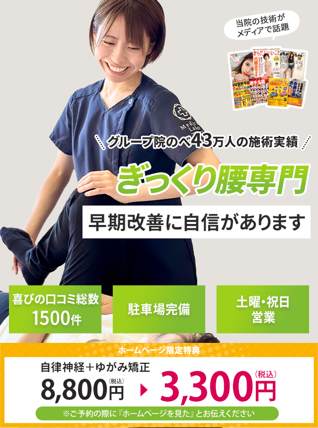 当院にはギックリ腰でお悩みの方が数多くご来院され、改善に導いています。一人で悩まず、お気軽に当院にご相談ください。